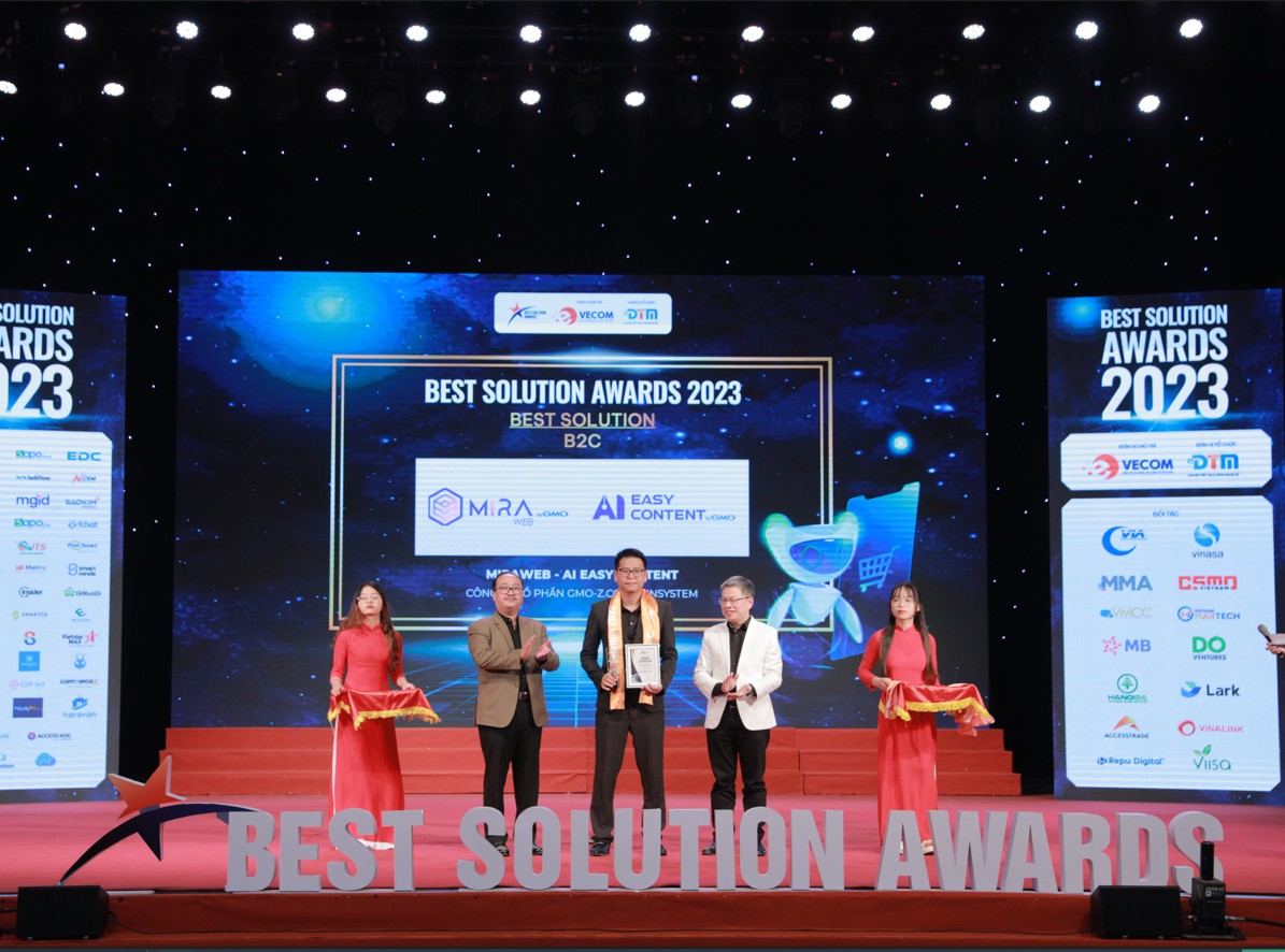 Bộ 03 giải pháp ứng dụng Trí tuệ nhân tạo là MiraWEB, MiraBOT, AI Easy Content của GMO-Z.com RUNSYSTEM với những hiệu quả vượt trội mang tới cho khách hàng đã xuất sắc chinh phục được các thành viên Hội đồng thẩm định Best Solutions Awards. Trong đó, MiraWEB đạt giải thưởng Best Solution B2C; MiraBOT đạt giải thưởng Prime Solution B2B. Đặc biệt AI Easy Content được xướng tên ở cả 2 hạng mục giải thưởng Best Solution B2C và Prime Solution B2B.