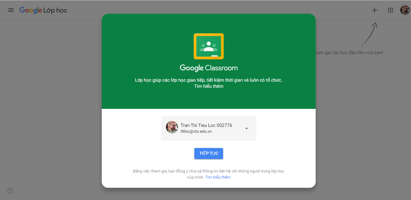 Sinh viên sau đó sẽ truy cập đến https://classroom.google.com, nhấp vào dấu + bên phải màn hình và chọn Tham gia lớp học.